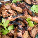 Przepis ten jest bardzo nieskomplikowaną wersją koreańskiego bulgogi, czyli wołowiny cienko pokrojonej, marynowanej w słodko słonym sosie i krótko grillowanej. Jest to jedno z ulubionych dań moich panów – często chodzimy w Nowym Jorku do koreańskich restauracji, gdzie na każdym stole jest grill i można wszelkie mięsiwa sobie samemu wysmażyć, ku uciesze mojego najmłodszego syna i wszystkich jego kolegów – o poparzeniach nie wspomnę;-).