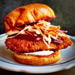 Gdy kurczak będzie podsmażony, smarujemy chleb majonezem. Kładziemy na połowę usmażonego kurczaka, polewamy sosem tonkatsu, na to układamy kapustę lub sałatę, przykrywamy drugą kromką chleba (majonezem do dołu).