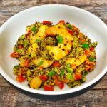 Przepis tłumaczę dokładnie, z tym, że ja dodałam mniej papryczki serrano (moim skromnym zdaniem można ją zastąpić pieprzem cayenne), moje krewetki były duże, ale i tak, i tak szybko się ugotowały, i jeszcze quinoa – moja była kolorowa. I dodałam więcej limonki i kolendry, bo kocham!;-)