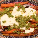 Pieczona marchewka z burratą i pistacjowym pesto