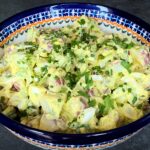 Sałatki ziemniaczane są w Stanach ogromnie lubiane. Zazwyczaj są serwowane w sezonie grillowym, jako dodatek do hot dogów i hamburgerów. Podaje się je również do mięs i kanapek. Jedną z najpopularniejszych jest sałatka niemiecka – wg mnie biedna siostra naszej warzywnej, bo składa się głównie z ziemniaków i sosu vinaigrette. Skandal, prawda?! Ja osobiście wolę bardziej wyszukaną wersję – którą z przyjemnością dzielę się tu z Wami, w oczekiwaniu na kolejną podróż do Polski, bo przecież nie ma jak u Mamy!