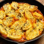 Nadziewamy ugotowany makaron masą karczochowo szpinakową – ok 1 łyżka na muszlę.