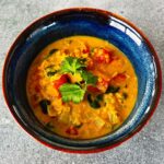 Odkryłam ją w ulubionym sklepie. Kupiłam, zjadłam i oblizałam się ze smakiem tak ze trzysta razy. Następnie przeczytałam skład, brzmiał zachęcająco, więc zrobiłam raz, drugi i trzeci. Zaczęłam się trochę bawić składnikami, bo a to dodałam brokułów, a to tofu, ale serce zupy pozostało to samo – soczewica, mleczko kokosowe i przyprawy. Od siebie dołożyłam świeżą kolendrę, cebulę i batata, bo pięknie się tu komponują!